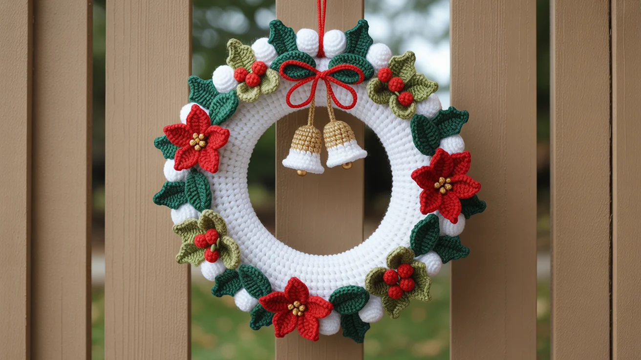 | Poinsettia Flowers | For each flower: Ch 7 → SC → HDC → DC → DC → HDC → SC (6 petals). Make 5–8 flowers depending on wreath size. |